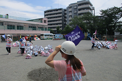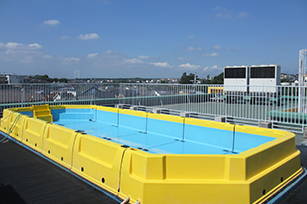 屋上のプールで周囲を気にせずプール遊びを行い、水に慣れ親しんでいきます。担任の他、補助の先生が常に3~4名で見守り、防犯カメラにて録画もしていますので、安心してプール活動を行えます。